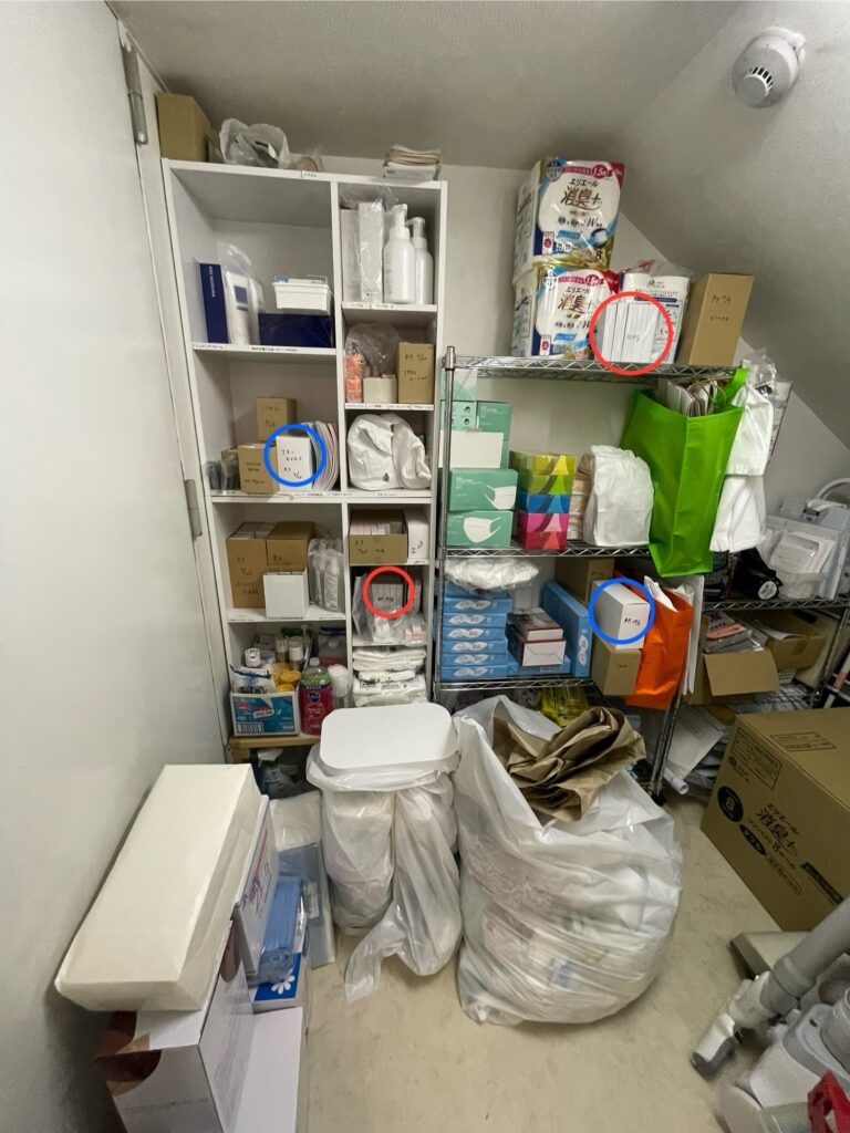 医療廃棄物や回収までの普通ゴミの保管もしている為、ラックの手前にゴミや段ボールがあることで下段部分が隠れてしまい何があるのか分からない状態に。