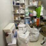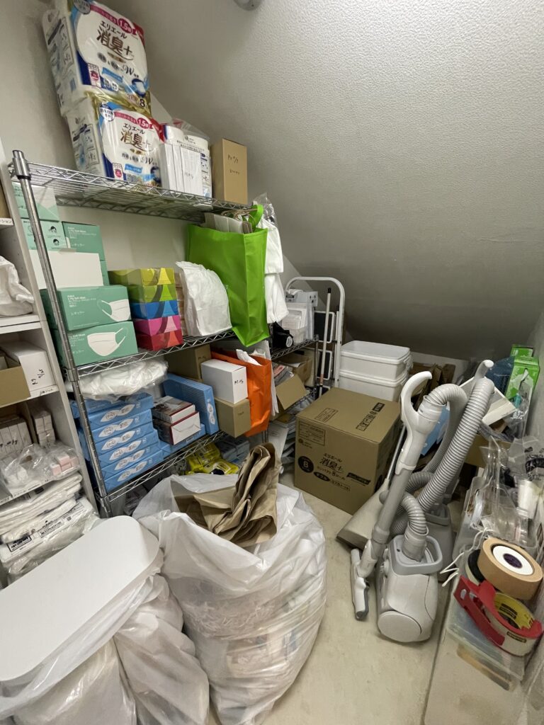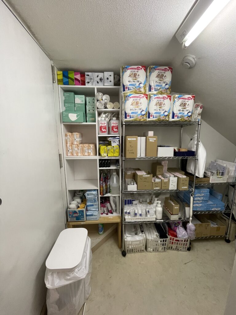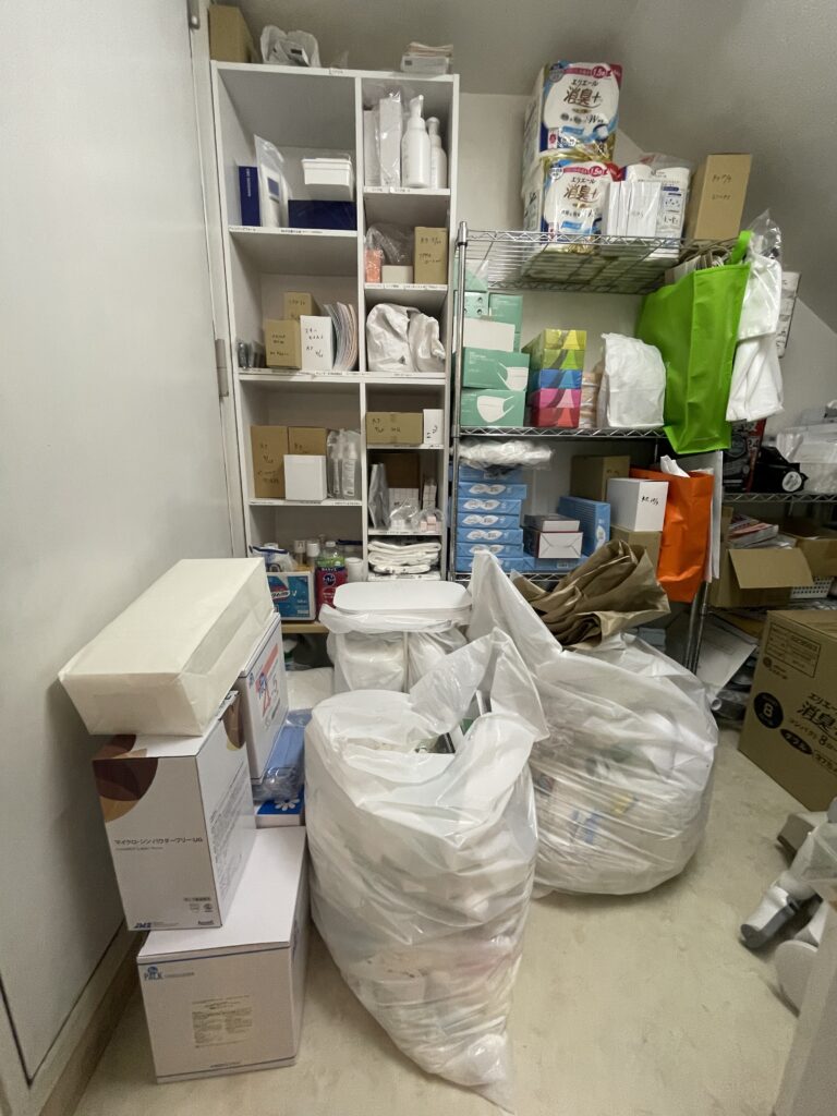 こちらの奥は皆さんで話し合い、保管品を置くことに。法律で保管期限が定められている書類やほとんど使用しないものを。手前には季節飾りや加湿器など年1回のペースで出し入れするもや医療廃棄物、回収前のゴミの保管を。