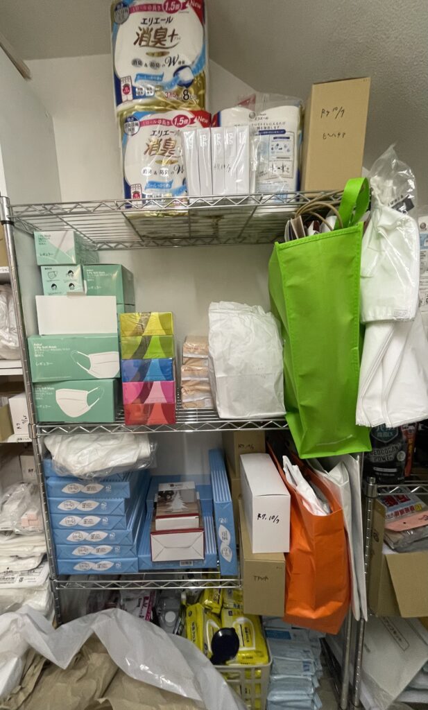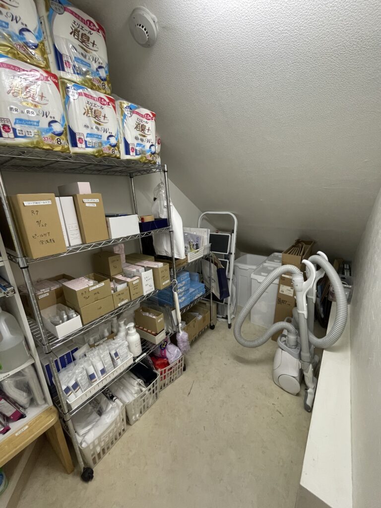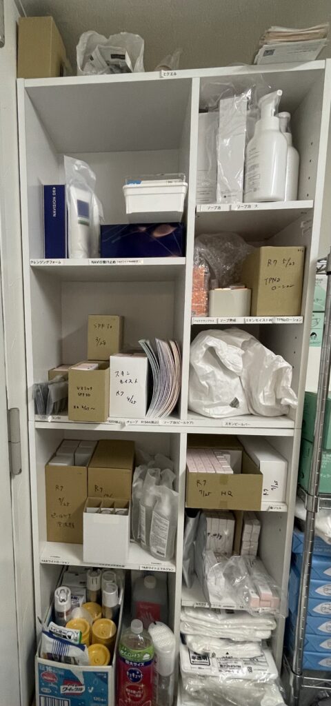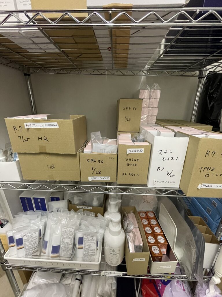 こちらの倉庫はスキンケアや化粧品などの商品と消耗品や日用品の在庫で埋め尽くされていました。